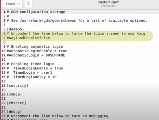 - Uncomment line 7 "WaylandEnable=false"