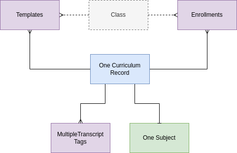 It is important to note that Curriculum is not directly associated with the Class. This association, and the nature of the association is accomplished only through template and enrollment records.