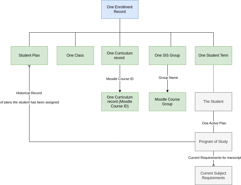 The enrollment record is key to tracking the courses a student takes, when they take them, and what grade the received in the course. The enrollment record is created and managed in the SIS, but controls all the information needed to automate the enrollment of the student in the correct Moodle course. The enrollment record also contains the correct information to be displayed on the student transcripts.