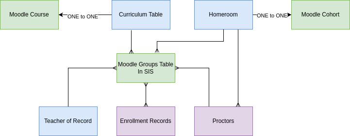 Each student enrollment records is related to one SIS Group record. Note there is no direct relationship between students, proctors, and Teachers, the relationship is created only through the SIS group record.