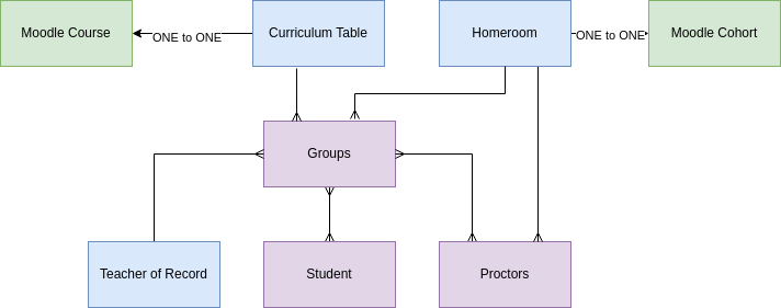 Students are related to multiple groups and only one homeroom. Note there is no direct relationship between students, proctors, and Teachers, the relationship is created only through the group record.