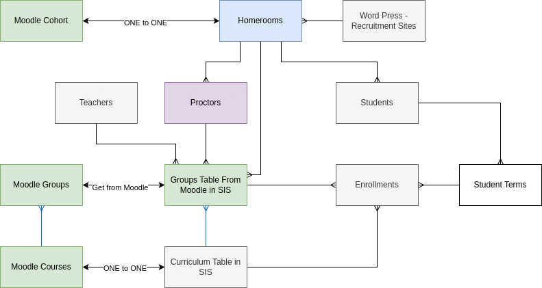 Note: above diagram shows one to many for proctors to Home rooms - this should be many to many.
