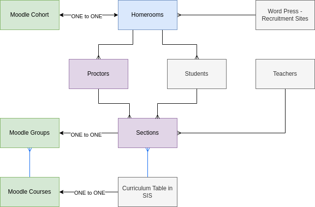 For every homeroom record there is a Moodle cohort. Cohorts are used to help assign students and teachers to the Moodle groups. Moodle cohorts do not provide privacy, only Moodle groups limit which students a proctor can review. Groups must be defined for each course the student takes. The homeroom is used to help assign students to the correct group in the course.