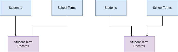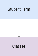 For each individual student, there are multiple student term records. Each student term record is related to only one school term record. However, when all the students are considered, the school term record will be related to multiple student term records, one for each student enrolled in that particular term.