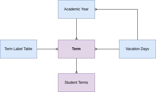 The term record is related to a term label record. A term label record stores the name of the term, fall, spring and the attributes common to all terms.