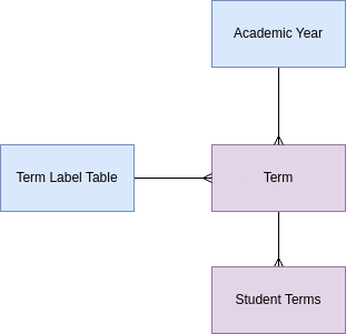 The term record is related to a term label record. A term label record stores the name of the term, fall, spring and the attributes common to all terms.